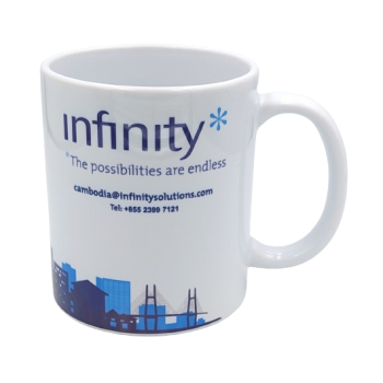 Standard size branded ceramic coffee mugs, high grade porcelain, dishwasher safe, ideal for corporate gifts and brand promotion